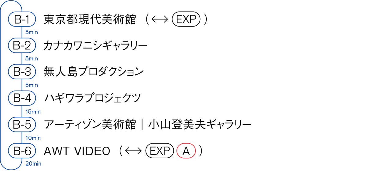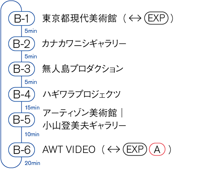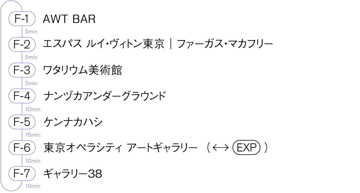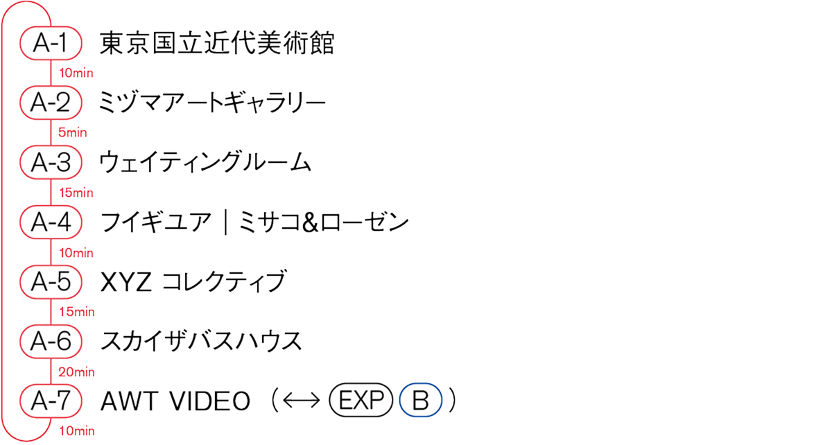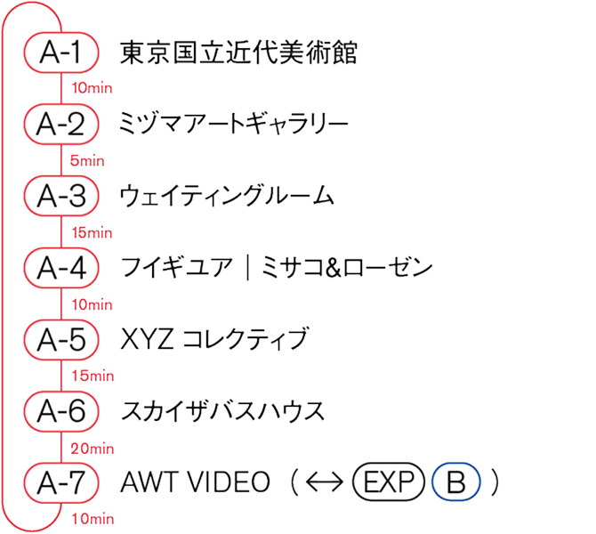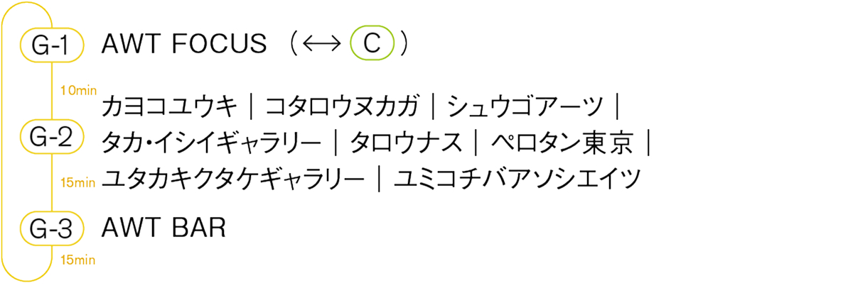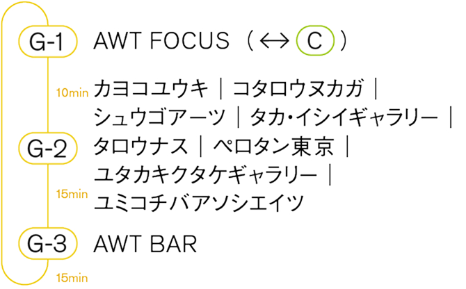 AWT FOCUSの会場(大倉集古館)と南青山のAWT BAR、六本木のギャラリーコンプレックス「ピラミデビル」や「コンプレックス665」をつなぐルート。