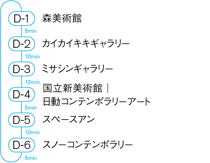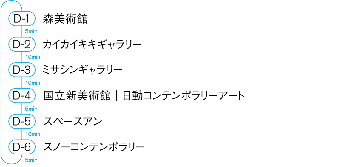 六本木の森美術館や国立新美術館や西麻布、青山一丁目を巡回。都心の裏路地に点在する注目ギャラリーを巡る。
