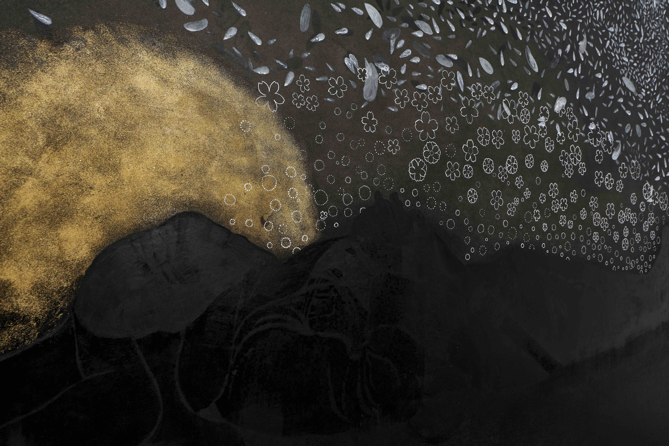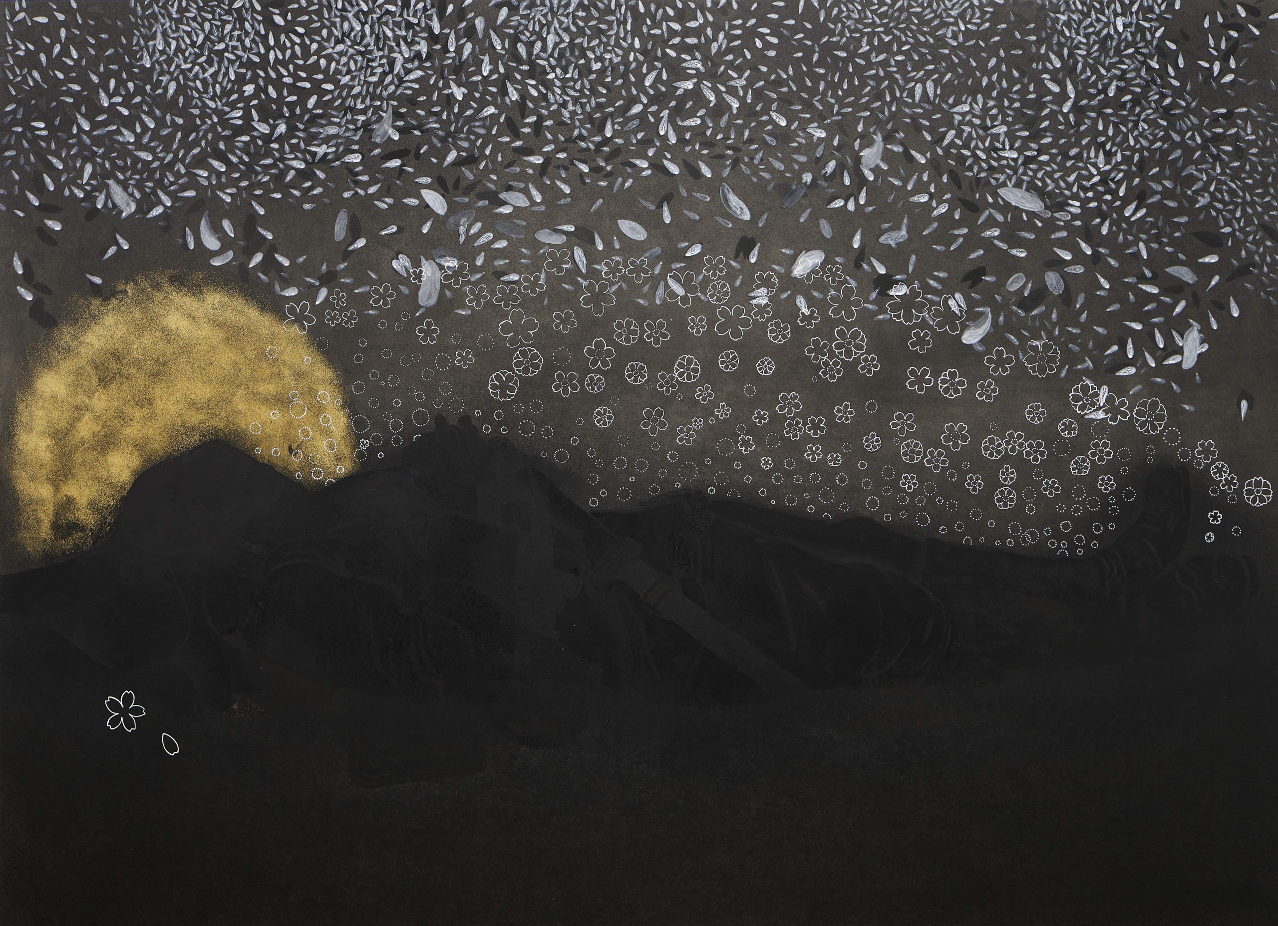 Sumi ink, pigment, animal glue, and gold leaf on washi paper mounted on panel