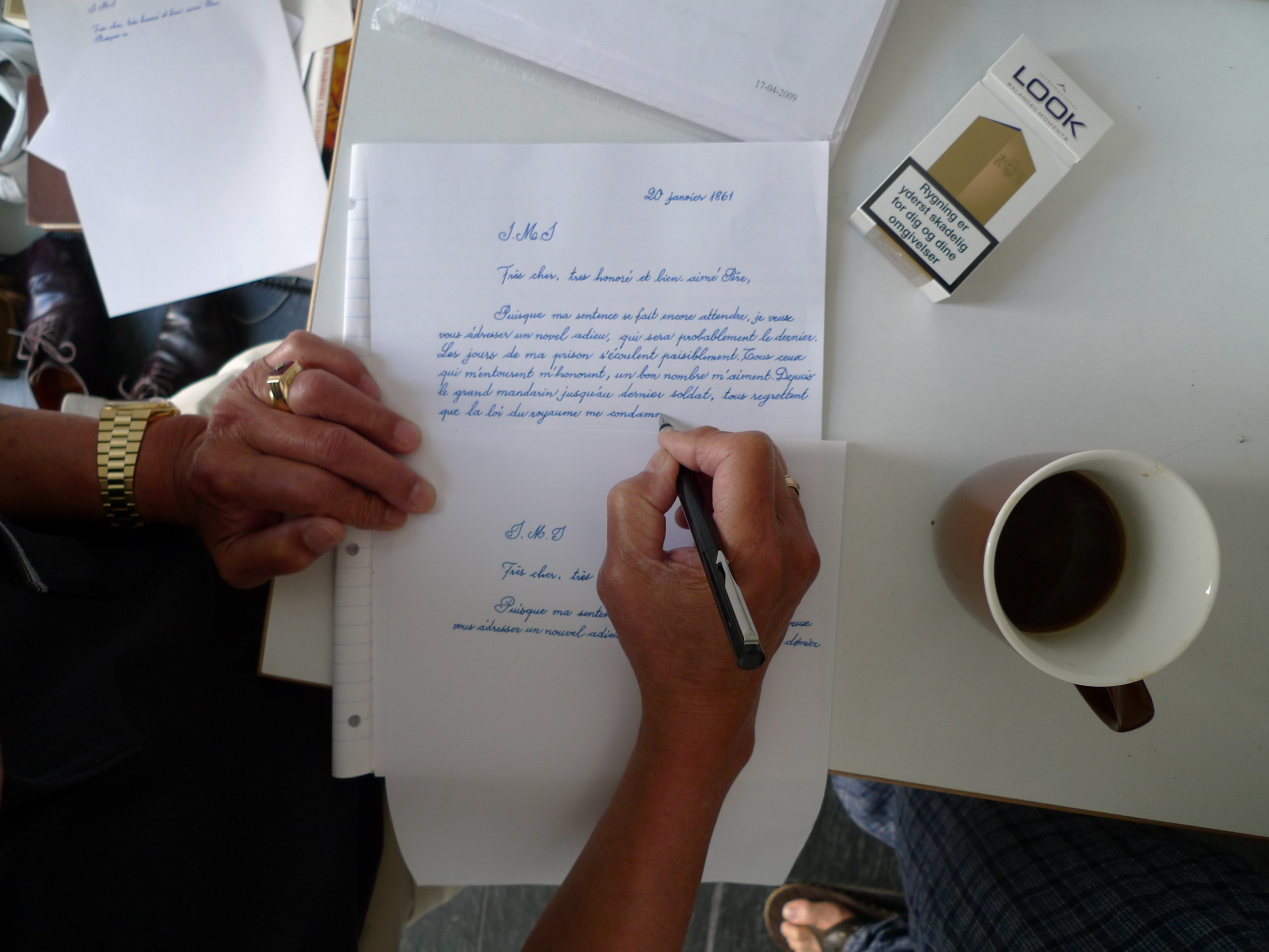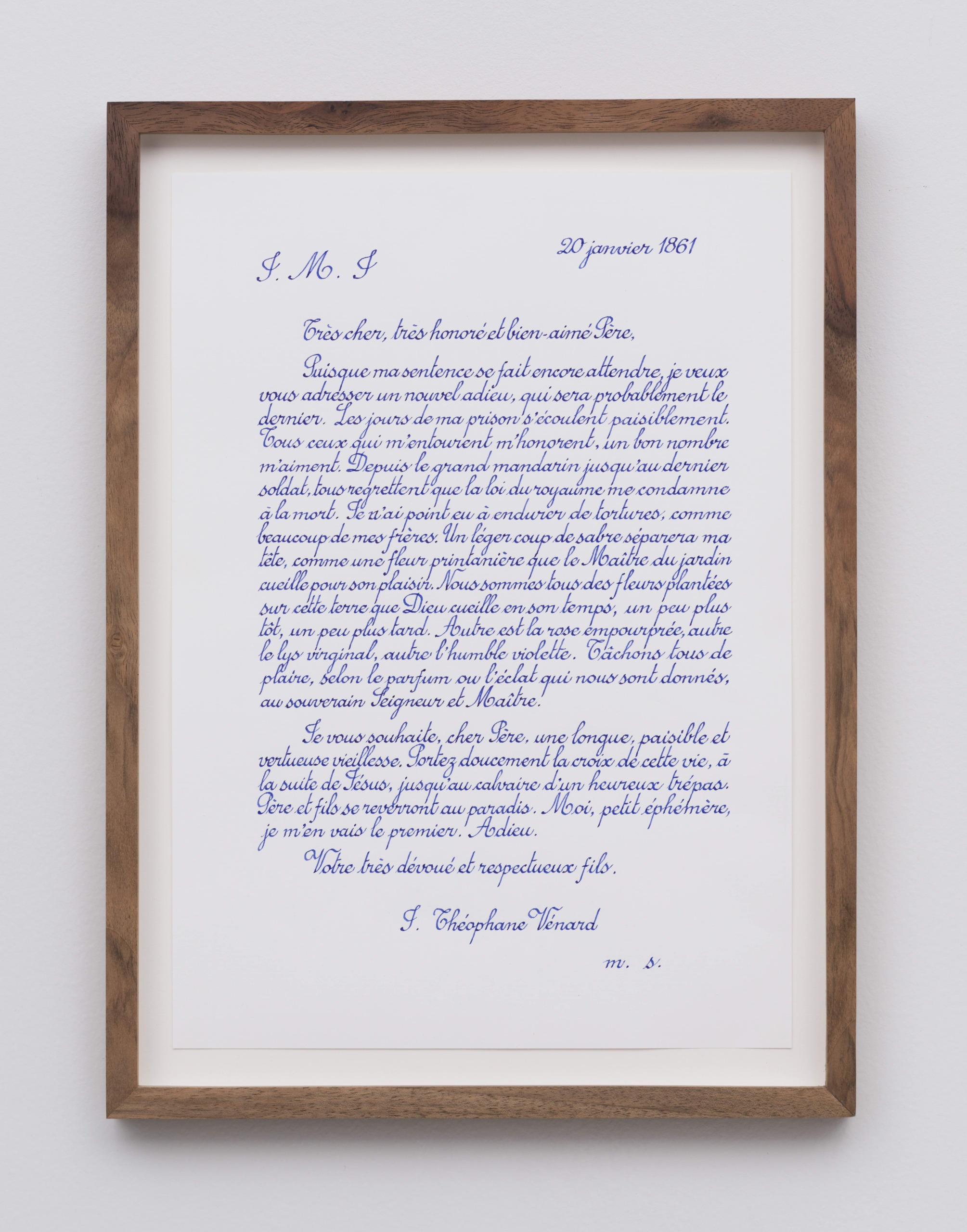 Last letter from St. Théophane Vénard to his father before he was decapitated, copied by Phung Vo in ink on paper, presented in special McNamara walnut wood frame