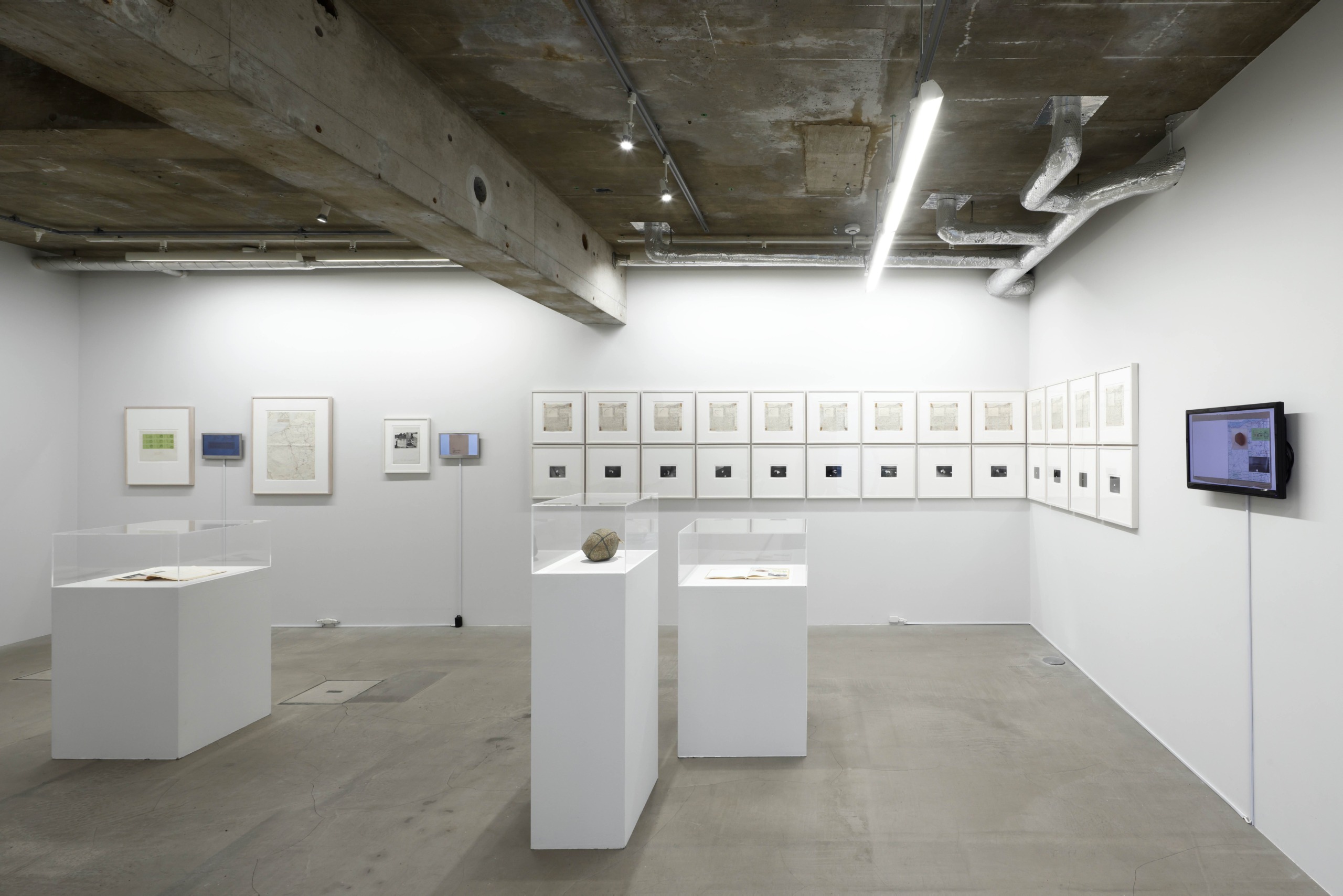 Set of 1 stone, 2 document booklets, 13 Xerox copies, 13 photographs, 2 document cards, 1 document map, and 4 single-channel video slideshows