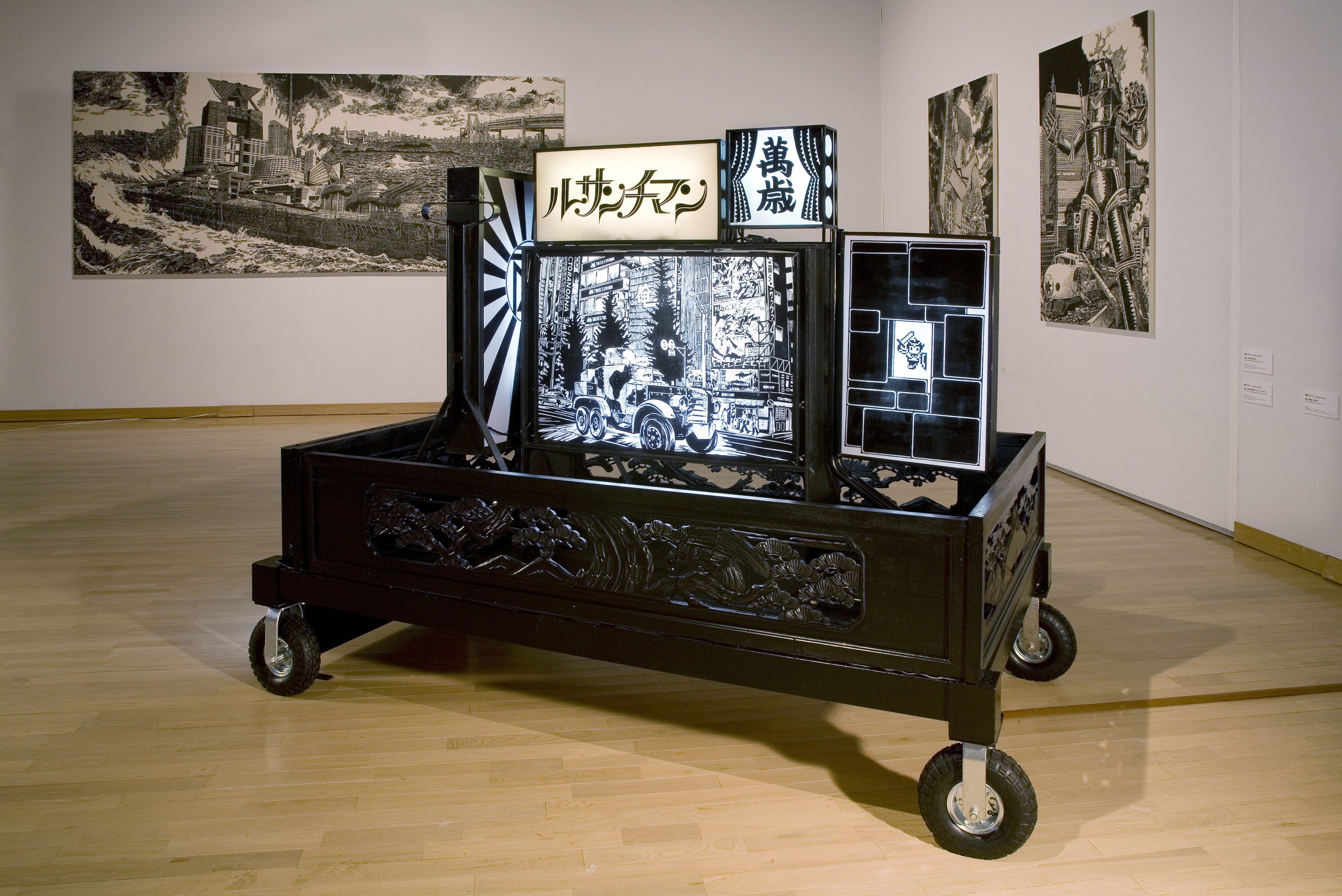 Woodcut print, lightbox display, acrylic sheet, bed, transom, wheel, mixed media